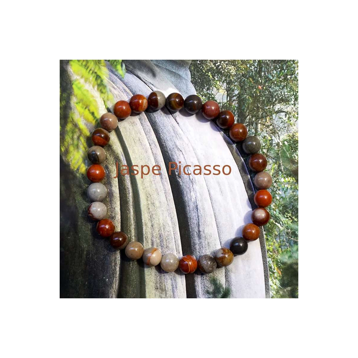 El Jaspe Picasso es una variedad única de jaspe reconocida por sus vetas y patrones que recuerdan a las pinceladas abstractas de un cuadro. Cada cuenta de esta pulsera es irrepetible, con tonos que van del gris al marrón, pasando por negros, rojos y cremas, creando un diseño natural y artístico.