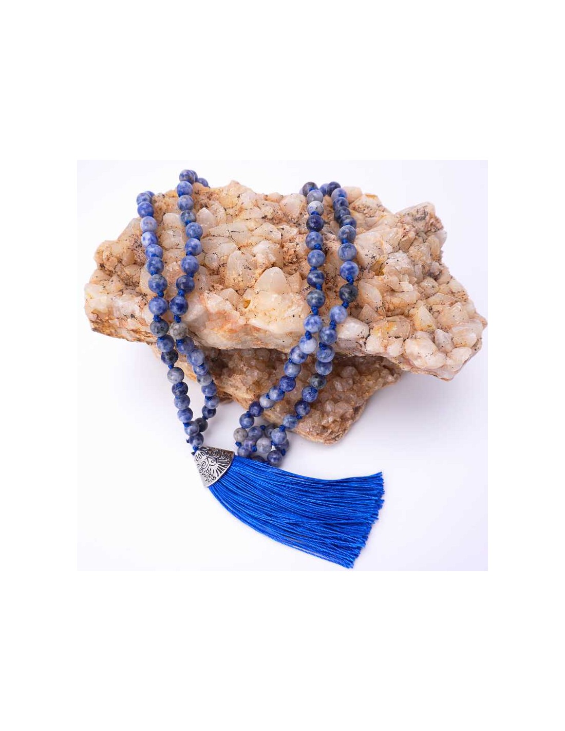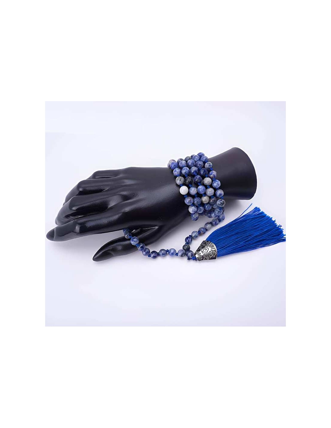 Exclusiva Japa Mala de 108 cuentas de sodalita, cuidadosamente diseñada para ayudar en tu práctica espiritual. Cada cuenta de sodalita, con sus tonos azules profundos, se selecciona para ofrecer una vibración calmante durante la meditación.