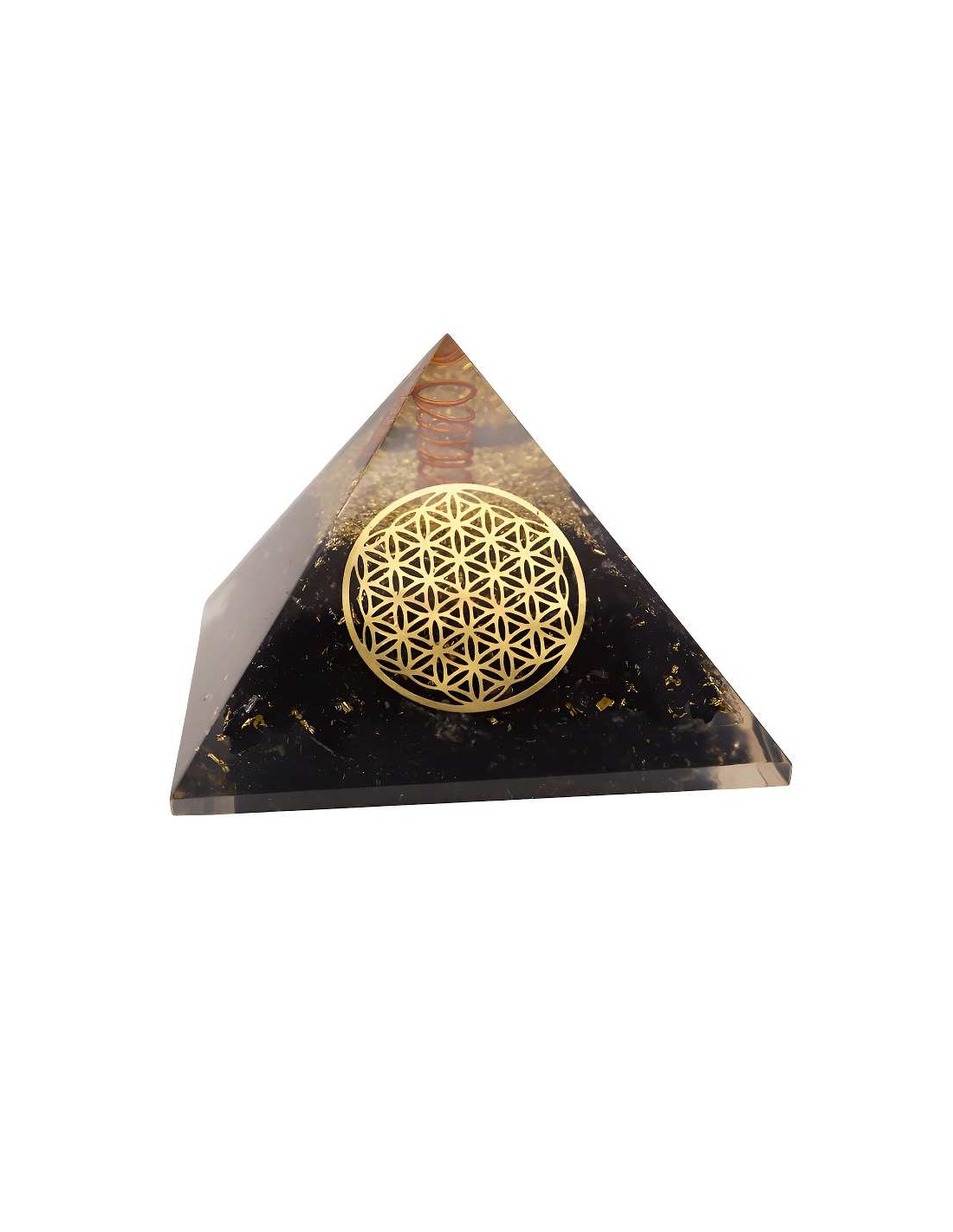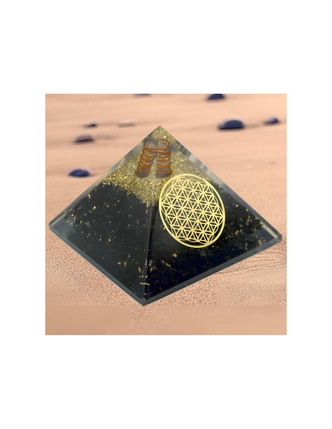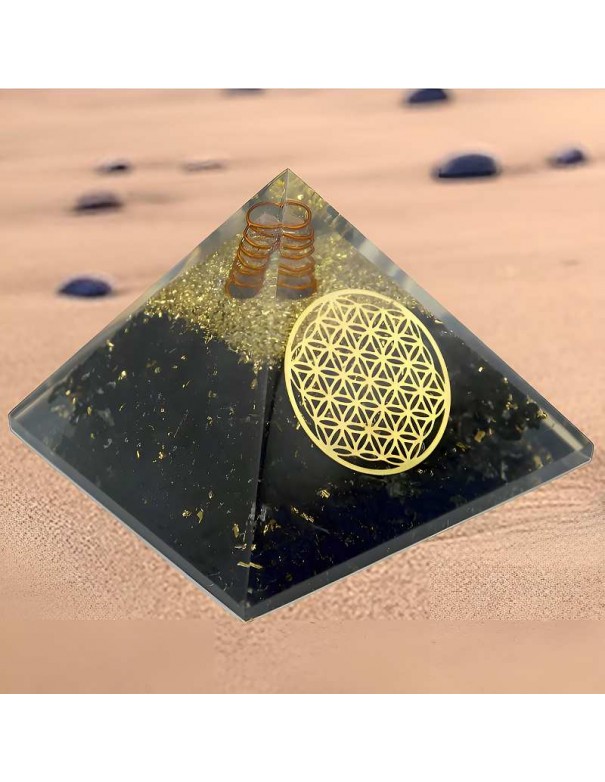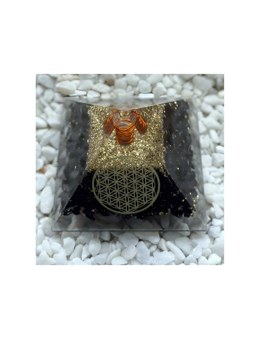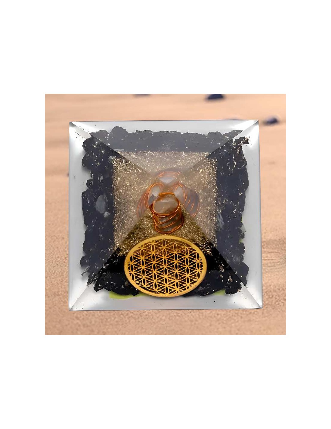 Auténtica Pirámide de Orgonita con Turmalina Negra y Cristal de Roca. Un poderoso generador de energía positiva con diseño de la Flor de la Vida. Ideal para armonizar espacios y proteger contra energías negativas.